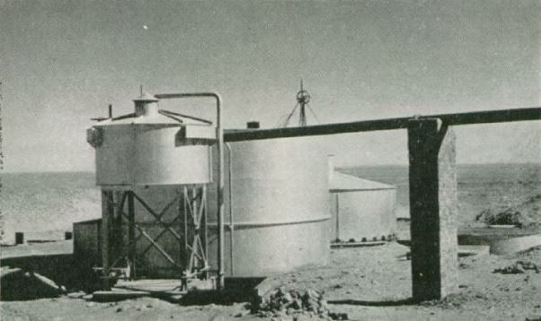 Les besoins en eau du chantier étaient presque aussi élevés que ceux de la base une fois celle-ci achevée. Malgré la multiplication des forages il en résulta de graves difficultés d’approvisionnement en eau tant que ne furent pas réalisés les réservoirs permettant aux forages de pouvoir débiter d’une façon continue. Jusqu’à leur réalisation on avait disposé auprès de chaque forage de citernes métalliques ou de réservoirs en caoutchouc de 10 à 25 m3 de capacité.
