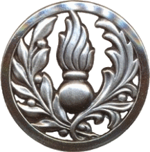 Roue dentée, bleu clair bordé d'argent ; au centre une feuille d'acanthe argentée et gravée, surmontée du dessin d’un cristal de neige émaillé blanc.