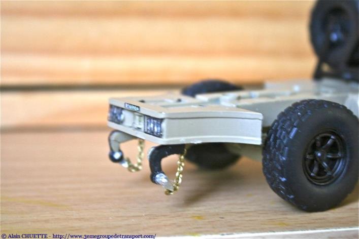 Profitant que le châssis était nu, j’ai ajouté 2 jerricansLe poste de conduite étant vide, il a fallu mettre un tringlot au volantLe Saharien a été façonné à partir d’un soldat en résine et le képi est fait en pâte à modeler qui durcit à l’air librePour la cabine, confection des rideaux (avec du vrai tissu)