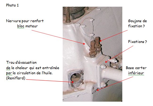 Sur la photo suivante, nous voyons la nervure de renfort du bloc moteur, ainsi que les deux trous servant à ce que j’ai appelé goujons de fixation sur la photo 1