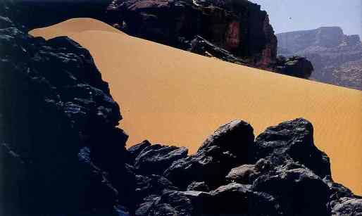 À travers l’obsédant silence, un chant d’oiseau suffit à soulever un instant de stupeur. Au cœur du plateau, un canyon vertigineux dont les abîmes plongent en à-pic de sept cents mètres semble jailli d’un terrible chaos cosmique. Les hallucinantes fêlures de la roche et leurs cimes désespérées nous éloignent du monde des vivants, mais la Tadrart où nous voyageons quelques jours plus tard, est une mer de sable onctueuse, douce et reposante.
