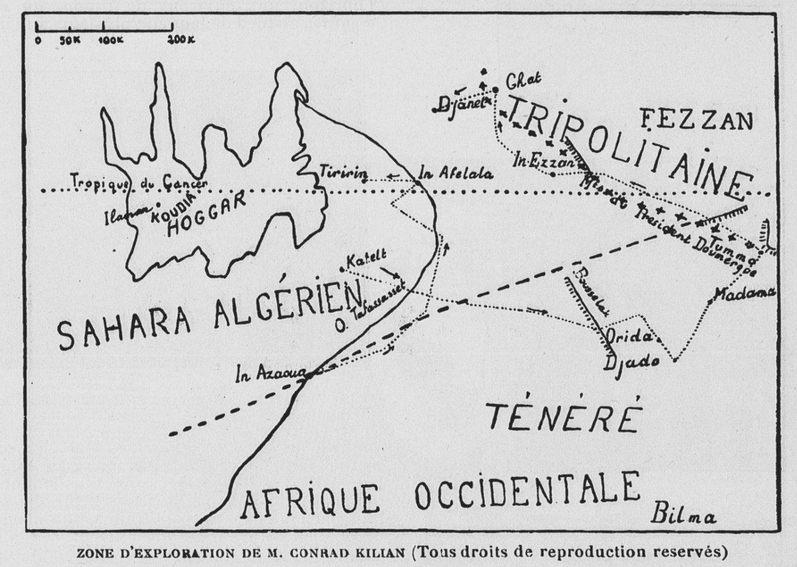 **Sur le tapis, de solides cantines ; au mur dokkalis et gandoura, une longue cravache, un collier de parade pour méhari ; sur la table des cartes et encore des cartes, de tous formats, à toutes échelles, usées jusqu'à la corde par 18 000 kilomètres de route, et annotées de signes à peine lisibles, des échantillons de plantes, de roches ou de fossiles, quelques récipients de cuir, bariolés de vives couleurs, boîtes à fard ou à bijoux, au pays touareg ; telle est l'installation algéroise de l'explorateur Conrad Kilian, enfermant tout un monde saharien dans le cadre à l'ordinaire mesquin et banal d'une chambre d'hôtel, témoins fidèles et combien émouvants de dures et périlleuses randonnées.