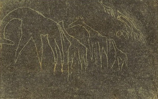Alors apparaît à nos yeux éblouis l’étrange fresque des girafes. L’un de nous laisse errer doucement la craie le long des traits recouverts d’une uniforme patine ocre, et voici que se dessine une magnifique girafe mâle ployant le cou pour se lécher les jambes d’un geste familier, et, suivant le chef du troupeau, une jeune girafe mordillant les crins de sa queue, puis uns autre suivie d’un girafon. Tout un troupeau en marche qui se continue sur une autre face du bloc polyédrique sur lequel est gravé l’ensemble. Le tout est étonnant de réalisme, de mouvement, de netteté, de mise en page, d’observation. L’excellent peintre Brouty, à qui j’ai montré mes photos, m’a déclaré qu’un très grand dessinateur ne désavouerait pas cette fresque. Qui donc était cet artiste inconnu, et à quelle époque vivait-il ?