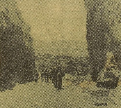 À dix heures du matin, nous franchissons le col géographique d’Aghelad. Sur le versant occidental nous pénétrons immédiatement dans un « canon » étrange et resserré, qui va se creusant de plus en plus. Le parcours est difficile, par endroits le passage, creusé dans des marnes rougeâtres, de couleur ocre, reposant sur des entaulements de porphyre, est si étroit que les chameaux ont peine à s’y faufiler avec leurs bagages. Il faut faire très attention aux guerbas qui risqueraient d’éclater contre les rochers.Où l’on évoque l’Atlantide